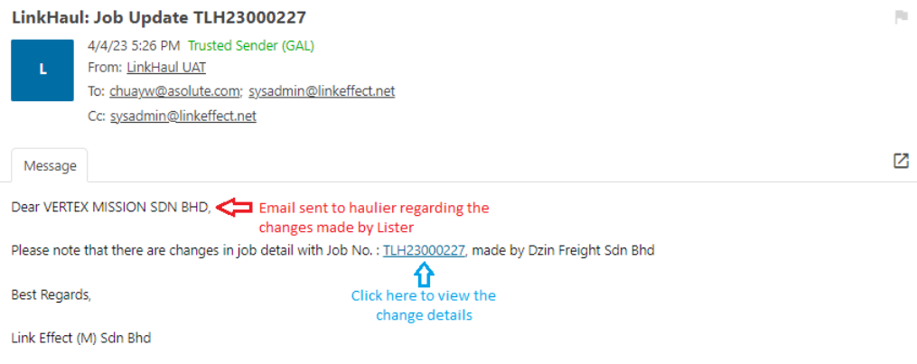 4. Email notification will be sent to both Lister & Haulier and you may click job number link for the changes: