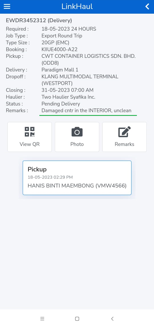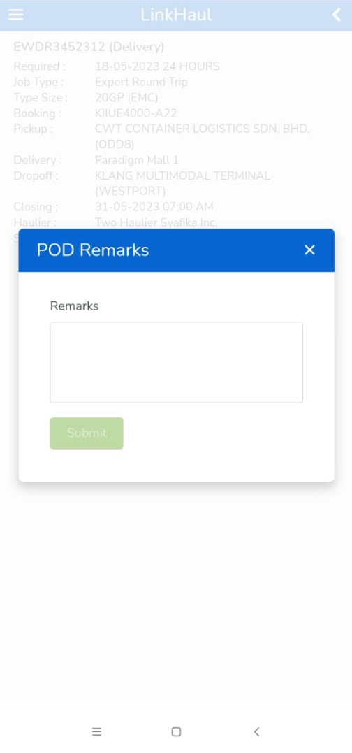 Next, you can also drop a comment about your container, for example if your container is damaged or is in dirty condition, you may insert these remarks into during this delivery process as below. Just click on 'Remarks' icon to input your comments: