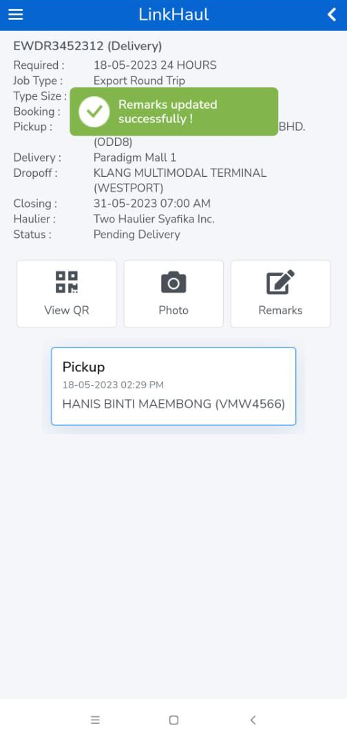 1. Please ensure to upload photo or add remarks if any before allowing the driver to scan the QR code for delivery confirmation.