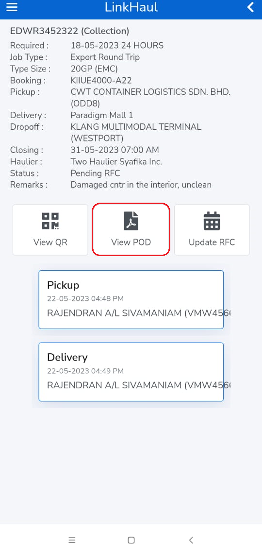 Once the container has been delivered to you, you can view your uploaded photos & remark in the electronic Proof of Delivery (ePOD) in the Collection stage: